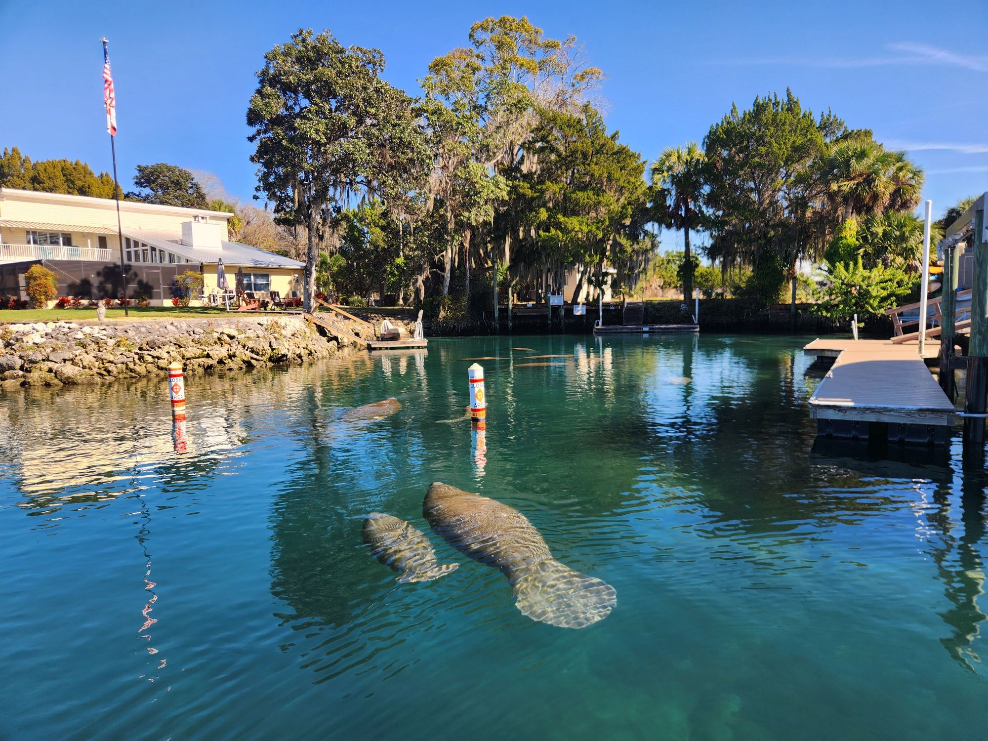 The unique freshwater ecosystem in King’s Bay features birds that swim and fish that fly! We have a variety of aquatic species, including both fresh and saltwater fish, occasional dolphin sightings, and of course, the majestic Florida Manatee!